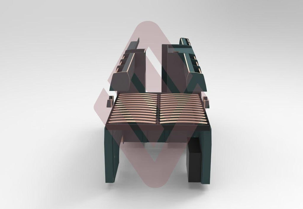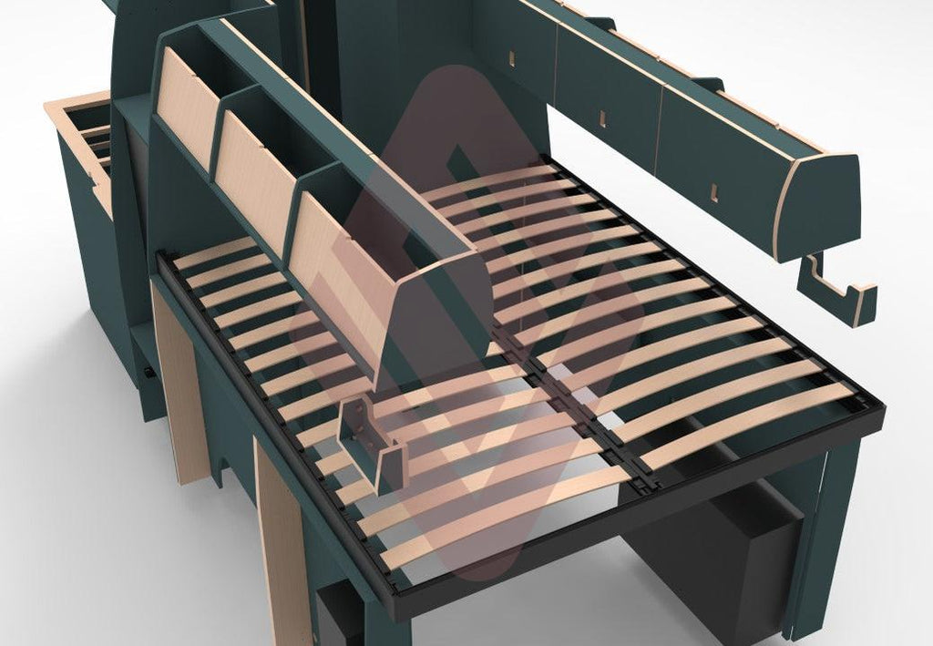This design brief focused on a large bed area allowing for a 1880mm length mattress for sleeping up/down the van and ensuring a minimum garage height of 1000mm for mountain bikes and maximum garage room.