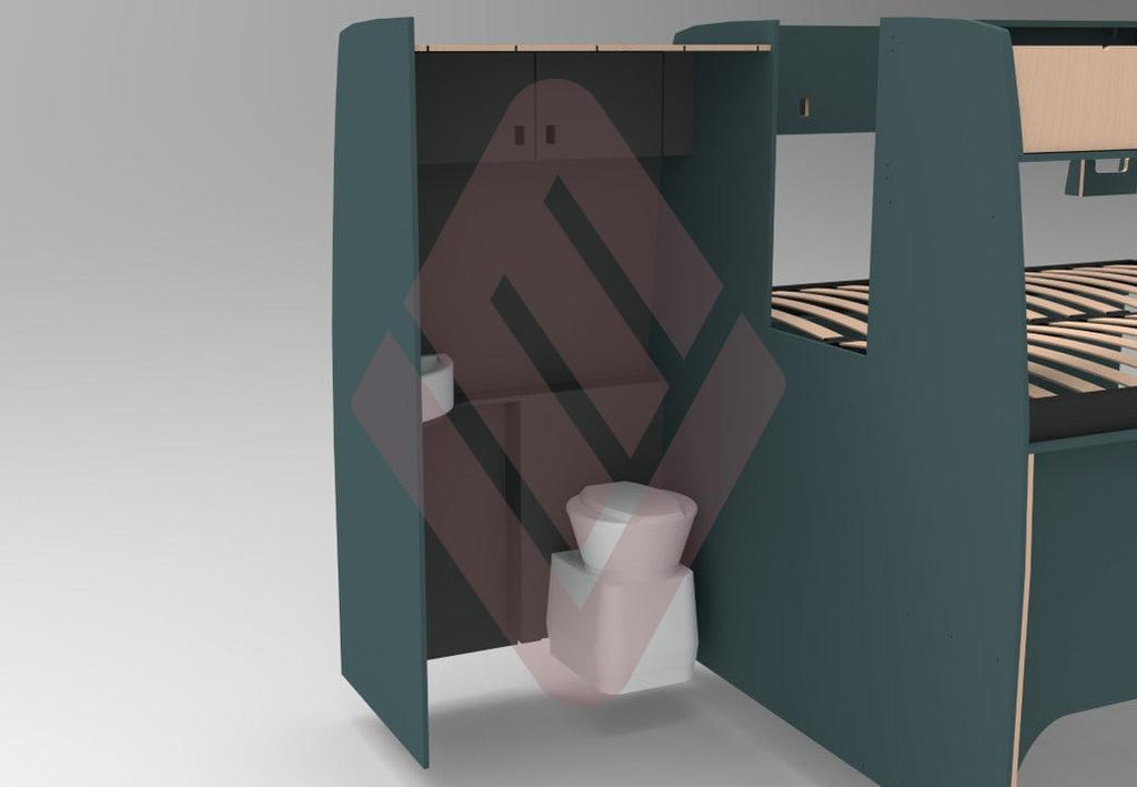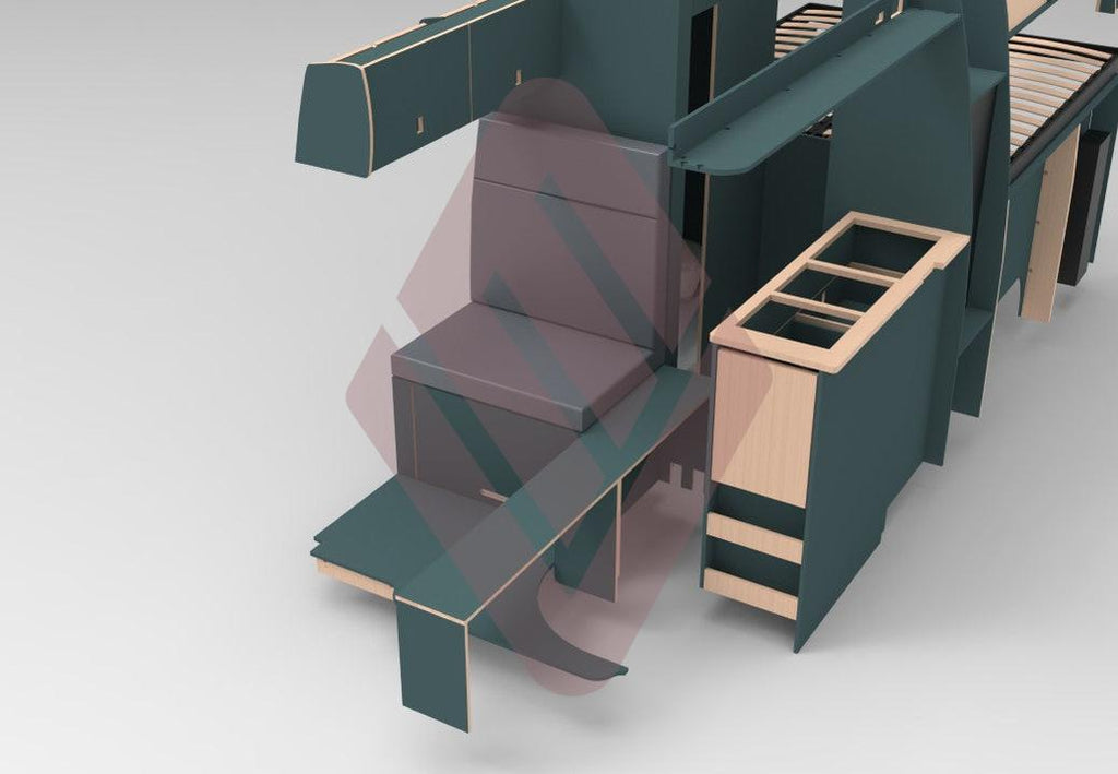 All our campervan units are designed in house and CNC cut from 15mm high pressure laminated lightweight ply (not to be confused with chipboard, MDF or paper backed lamination) and constructed with premium quality hinges, catches, drawer runners and camlocks from Hafele (no eBay or Amazon specials here).