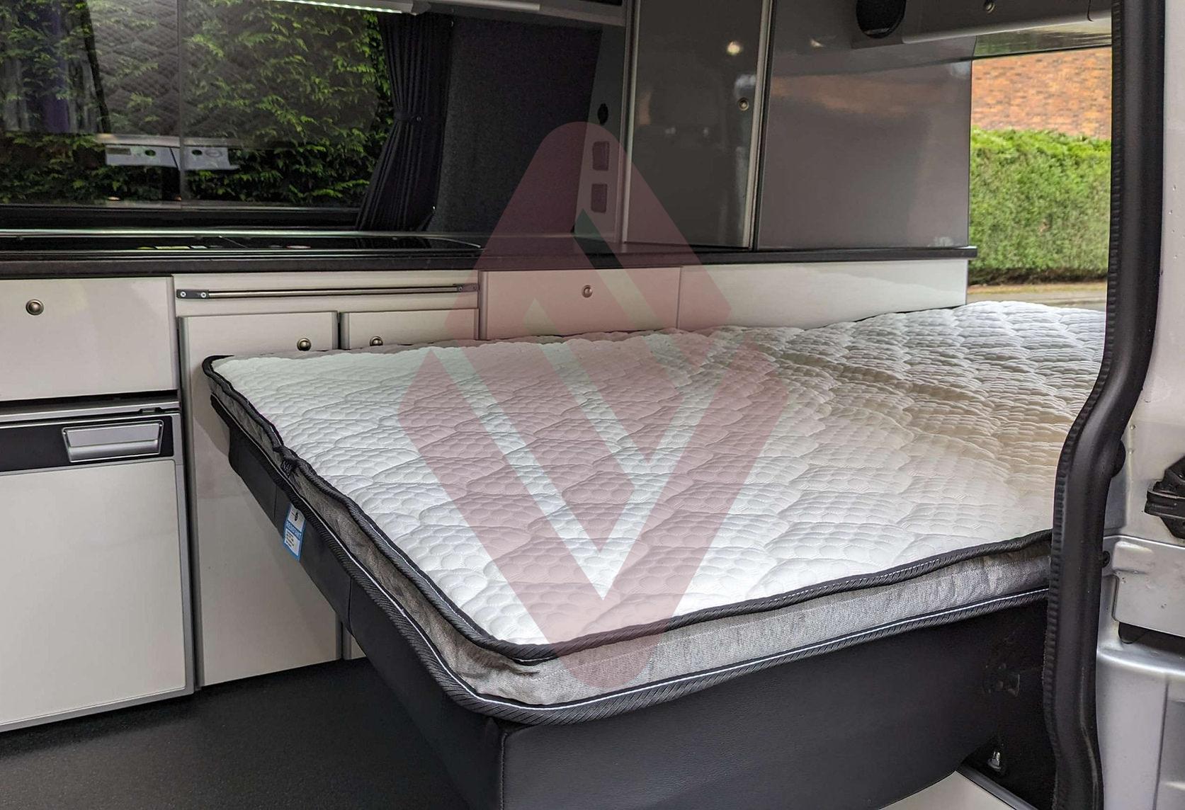 A luxury 2.5” dual reflex & memory foam mattress with a built in comfort quilted cover and wipe clean black underside. Custom made to perfectly fit a 112cm RIB or R&R campervan bed. Rolls up neatly to be stored away within the van, taking up minimal space.