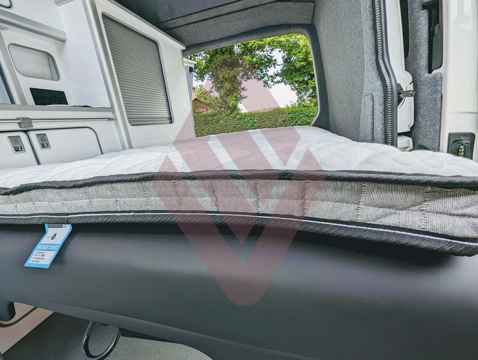 A luxury 2.5” dual reflex & memory foam mattress with a built in comfort quilted cover and wipe clean black underside. Custom made to perfectly fit a 3/4 campervan bed. Rolls up neatly to be stored away within the van, taking up minimal space.