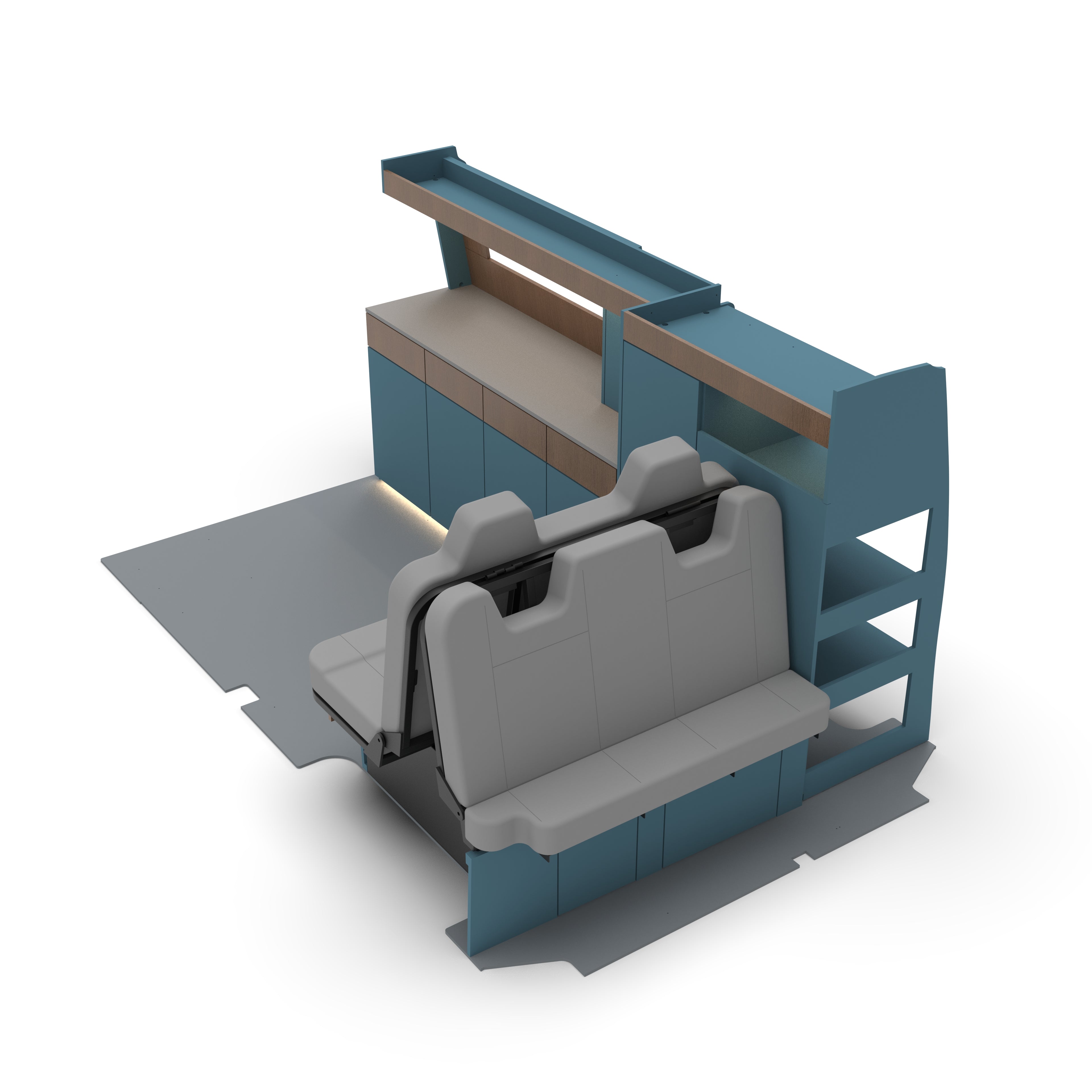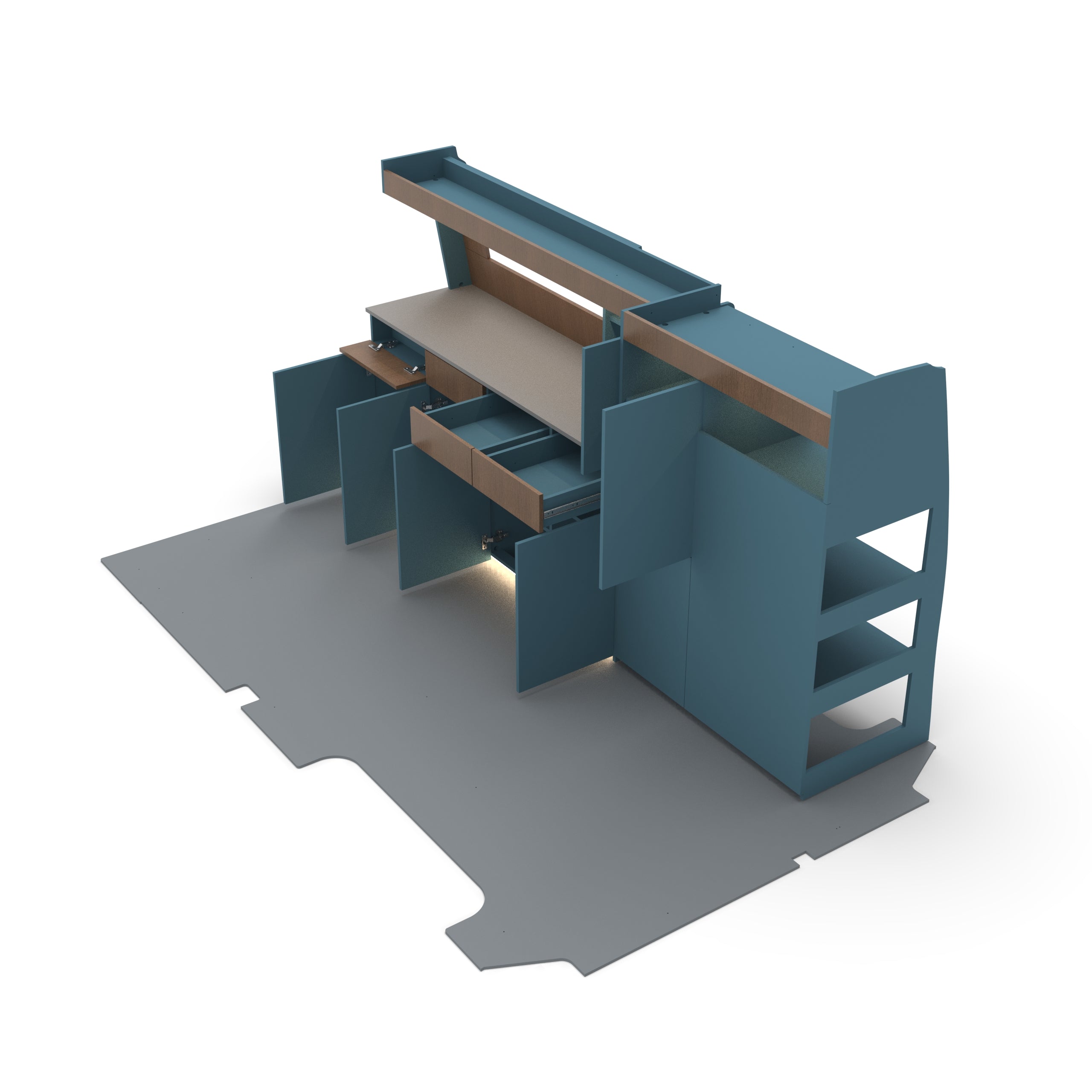 Our take on the 'classic' campervan kitchen design, arguably the most popular layout, the typical side kitchen ready to be paired with a rock and roll bed, experience our redefined flowing look, expertly crafted to maximise space and functionality. Its innovative layout makes the most of every available inch, providing essential storage and a spacious worktop, all constructed from premium materials for lasting durability. Designed with precision, this furniture set transforms your campervan interior into a highly efficient and stylish living space.