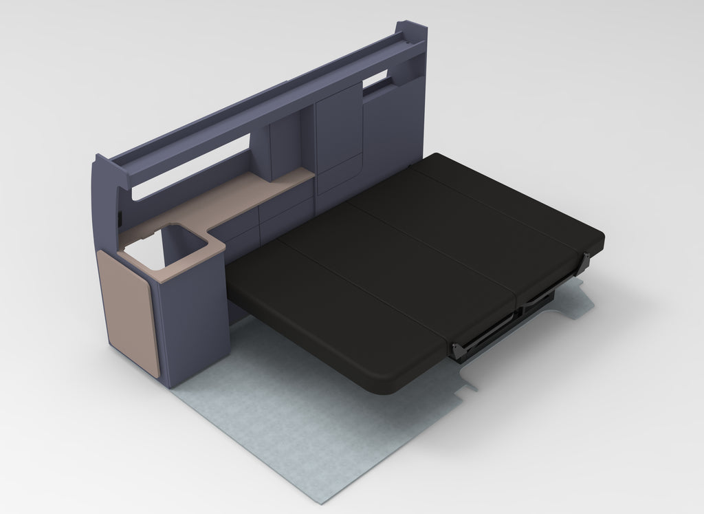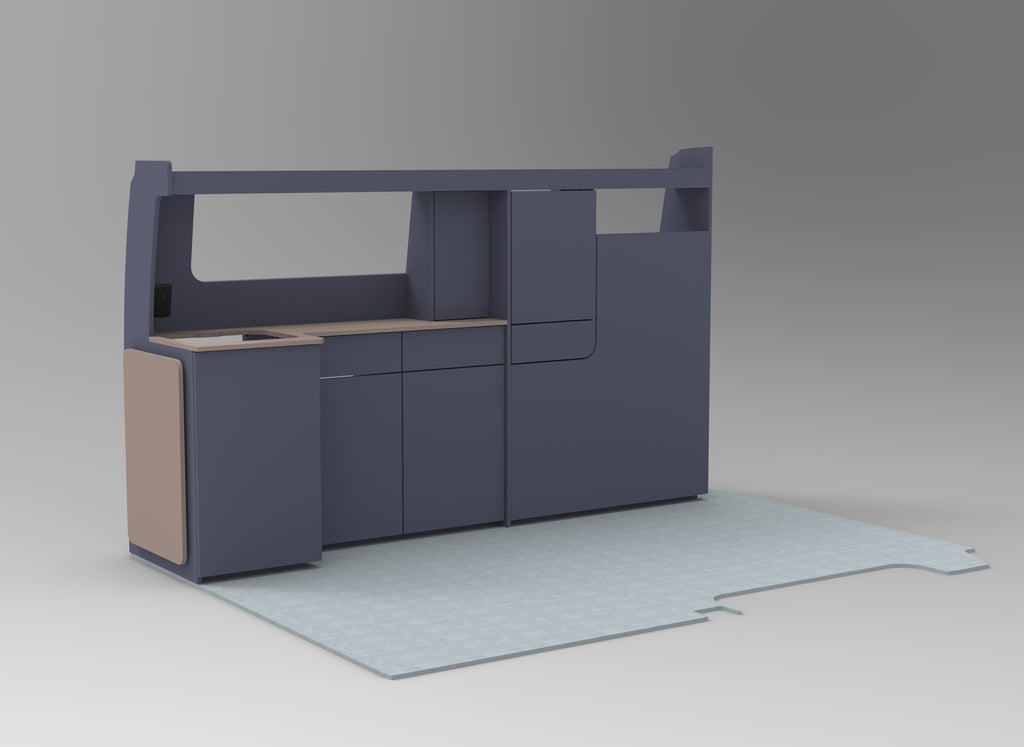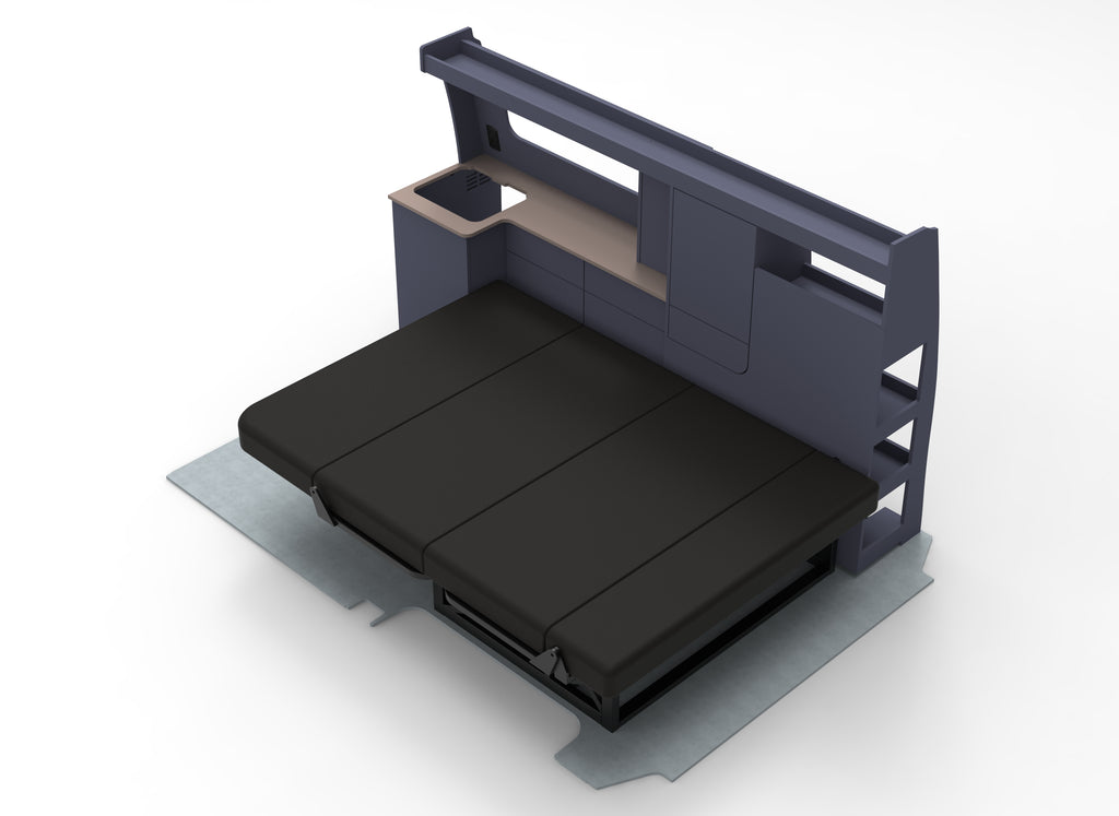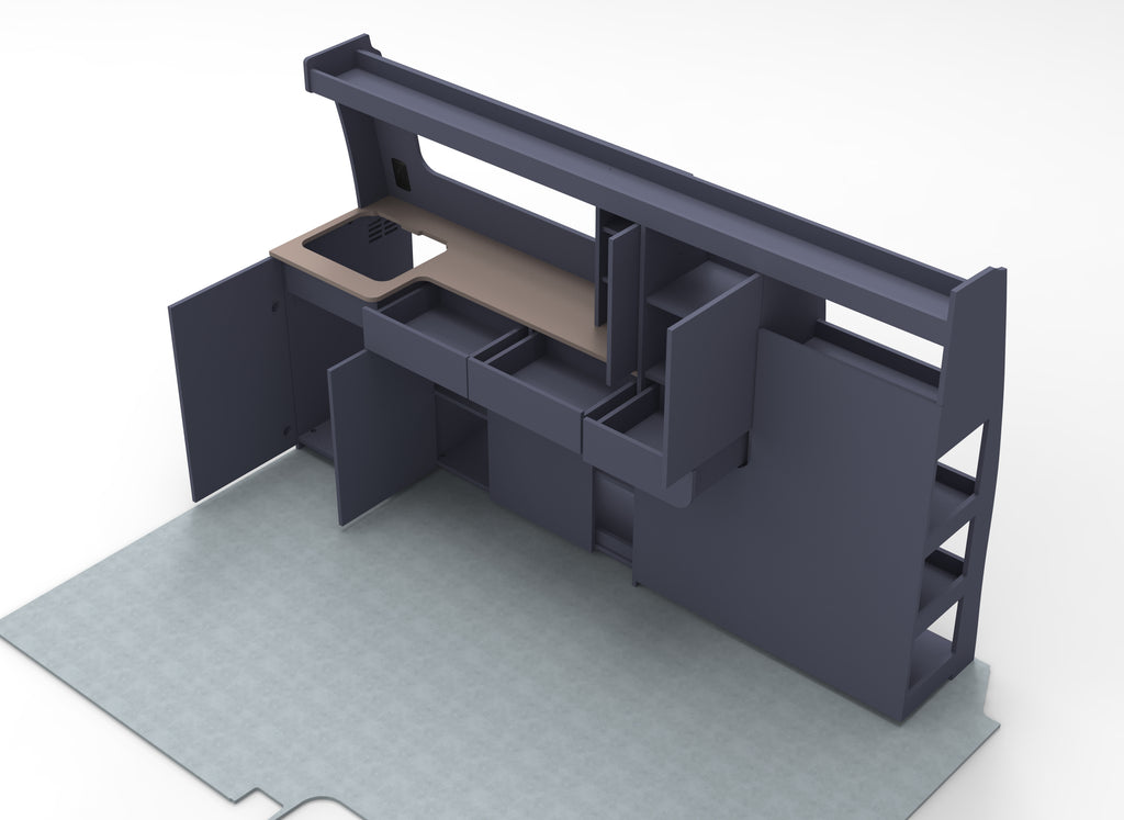 The slimline spin on the 'classic' campervan kitchen design, for those who want to compromise on kitchen and benefit from a bigger seating and sleeping area, the typical side kitchen ready to be paired with a 120cm rock and roll bed, experience our redefined flowing look, expertly crafted to maximize space and functionality. Its innovative layout taps into every available inch, gaining important storage and a spacious worktop, all constructed from premium materials for lasting durability. Designed with precision, this furniture set transforms your campervan interior into a highly efficient and stylish living space.